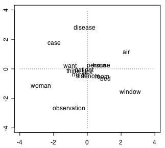 非類似度で表した hfv_items 同士の関係を2次元に縮約した結果は上図のように作図される。これを描く mds.R の中身は下記の通り。