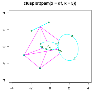 clusplot(pam(df,5), xlim=c(-4,4), ylim=c(-4,4))