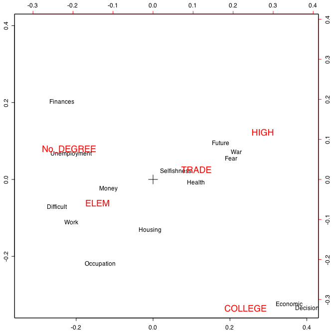 ca_sample.txt には『Exploring Textual Data』の第三章「Correspondence Analysis of Lexical Tables」冒頭のサンプルデータを利用した。