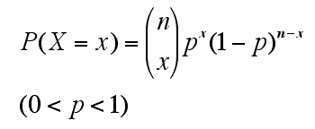 確率変数X(random variable X)の値が0を含む任意の自然数x(ただし n 以下 )のとき、確率分布は次の数式によって表される。(参考)