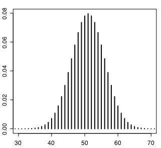 plot(dbinom(0:100,100,0.5),type="h",lwd="2",xlim=c(30,70))