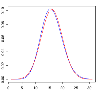 正規分布 N(λ,λ)はλが十分大きいとき、ポアソン分布と近似するとされる。λ=15のポアソン分布とN(15,15)を比較して確認する。